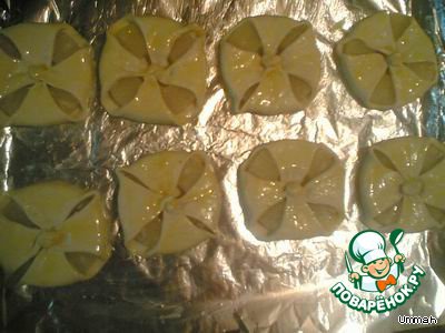 Получившиеся изделия выложить на смазанный маслом противень или пергаментную бумагу, также можно использовать фольгу. Смазать поверхность изделий яичным желтком.