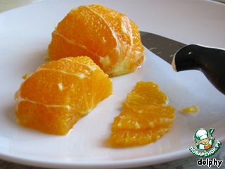 Апельсины очистите от кожуры, разрежьте пополам, а затем нарежьте тонкими полукругами.