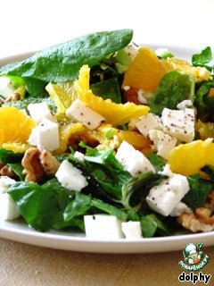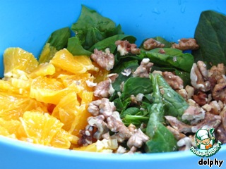В миске соедините шпинат (если листья слишком большие, порвите их), апельсины и орехи. Перемешайте.