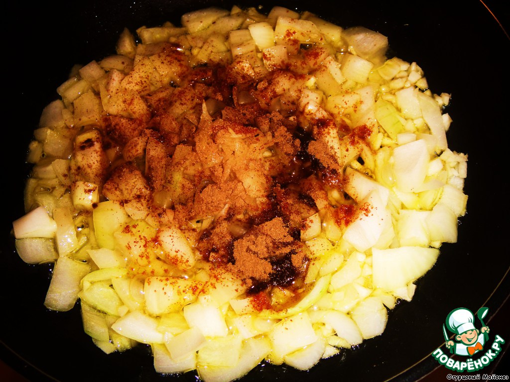 Мелко рубим лук, чеснок и имбирь. Выкладываем на сковороду с растительным маслом, добавляем туда же корицу, сахар и молотый перец чили. Обжариваем всё вместе до прозрачности лука.