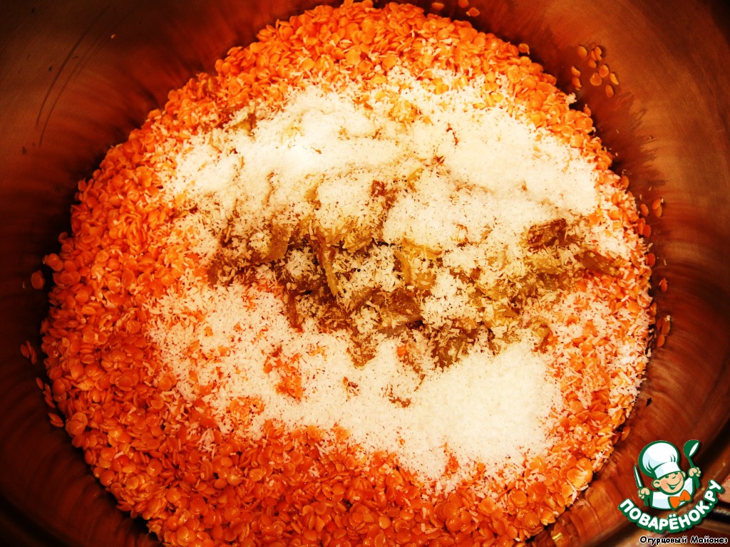 Промытую чечевицу перекладываем в кастрюлю, смешиваем с луковой поджаркой и кокосовой стружкой.