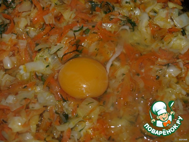 Нарезаем мелко лук, отправляем его на сковороду с растительным маслом, трeм морковь и добавляем к луку, затем шинкуем капусту и еe туда же, в конце помидор. Тушим под крышкой 5 минут, затем добавляем сырое яйцо и зелень( у меня укроп)перемешиваем и оставляем остывать.
