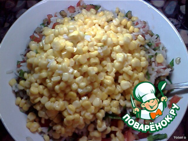 Из баночки кукурузы полностью сливаем сок. Добавляем ее к салату.
