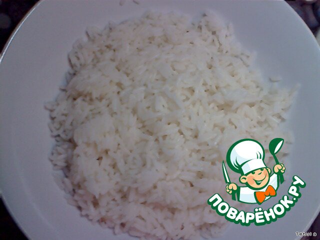 Рис моем и отвариваем в кипящей, чуть-чуть подсоленной воде до готовности. Промываем холодной водой, даем стечь и отправляем в салатницу.