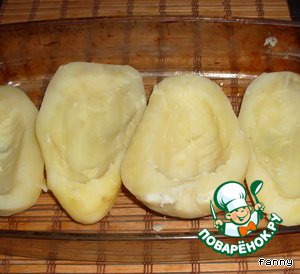 Картофелины почистить, отварить почти до готовности, разрезать вдоль пополам. Из каждой половинки выскрести ложечкой мякоть.