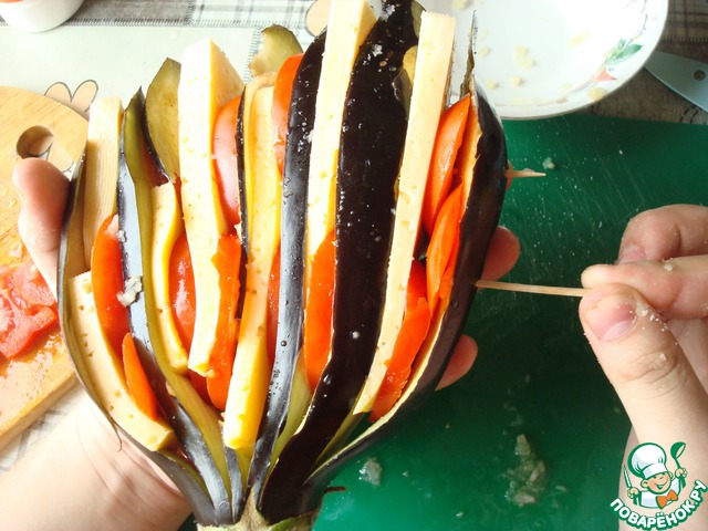 Лучше пользоваться длинными шпажками. Они хорошо скрепляют наш баклажан, а это залог того, что он не развалится в духовке.