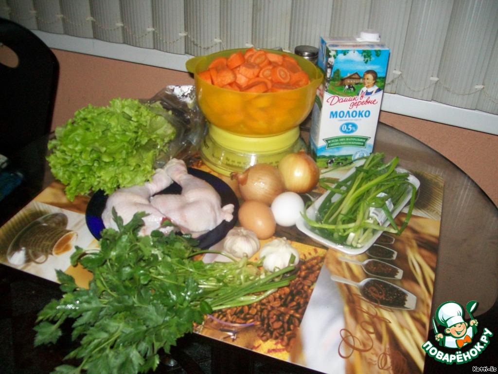 У меня на фотке два окорочка. Мне показалось, что один слишком мало. Ну чего там останется после того, как снимешь шкуру и отваришь? Я специально их взвесила, чтобы Вам было проще разобраться в пропорциях. Два окорочка весили 430гр. Морковка уже очищена и нарезана, ровно 1 кг. Остальное - лук, зелень, яйца, это уже не принципиально. Так что приступаем.
