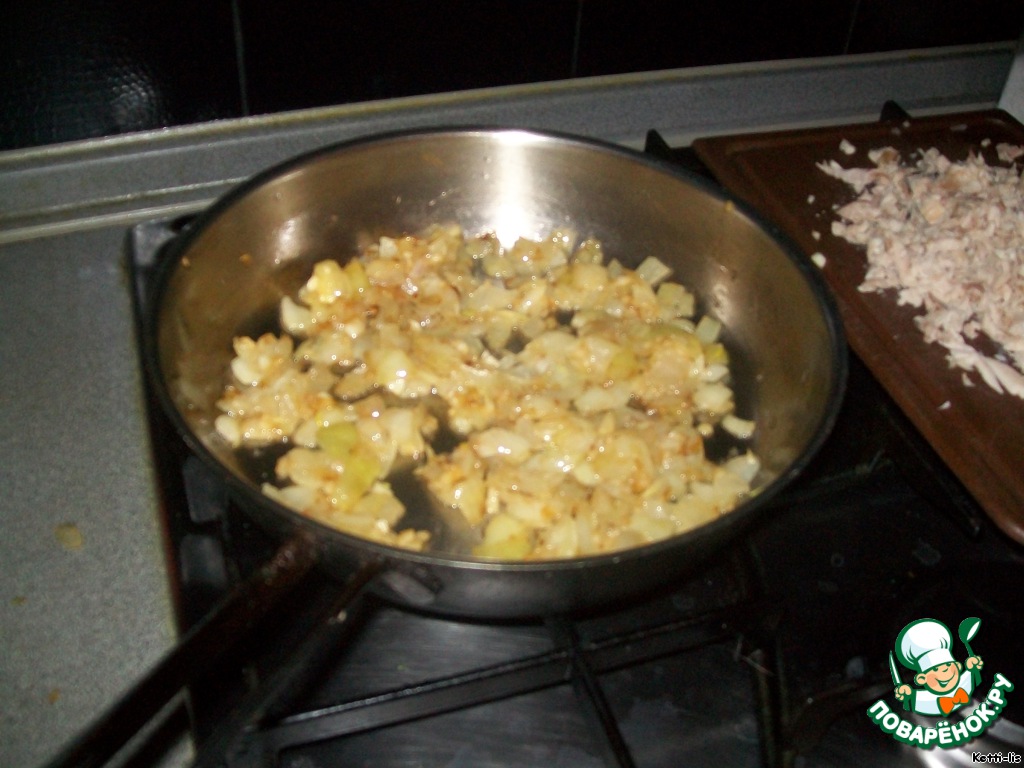 Как только поджарочка наша приобретет такой цвет, то добавим курицу нашинкованную.