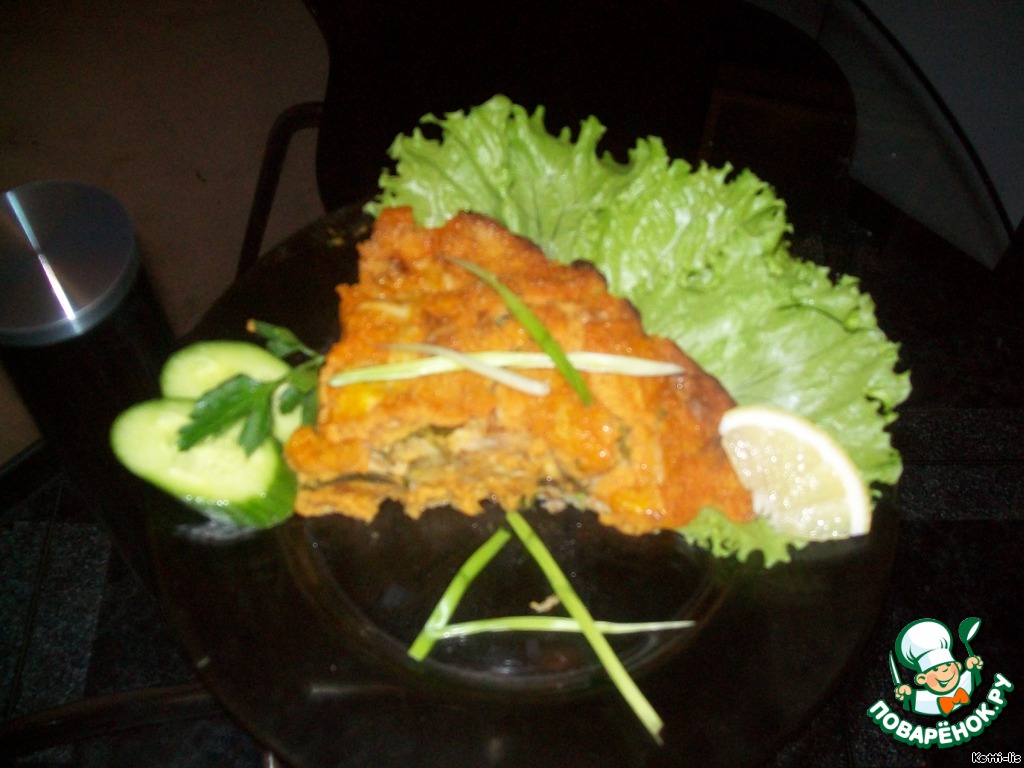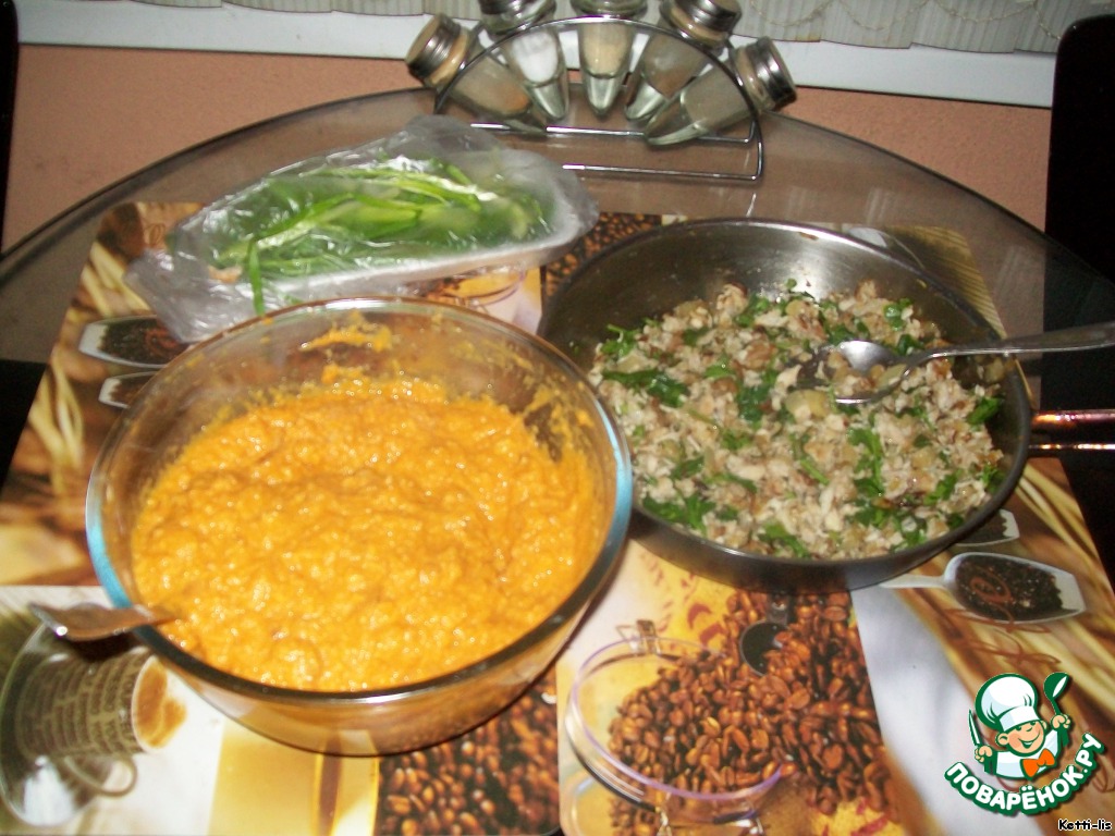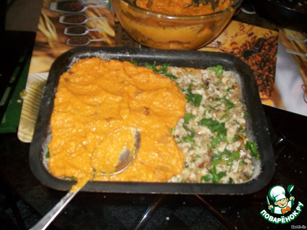Форму для запекания смазать растительным маслом и обсыпать панировочными сухарями. Выложить слой моркови. Потом куриную начинку, сверху опять морковь. И присыпать сухарями. Отправляем в духовку на 40 минут при 180 градусах.