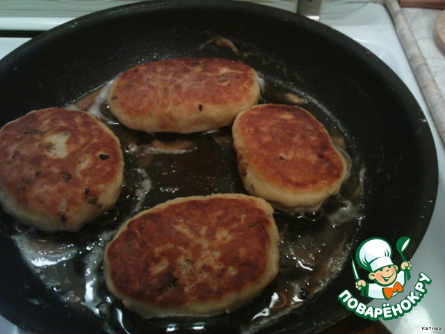 Формируем,как пирожки:из картофельного теста делаем лепешечку,в центр кладем начинку,краешки защипляем,обваливаем в муке приплющиваем,как сырник и кладём АККУРАТНО,чтоб не порвать,швом вниз на сковородку.