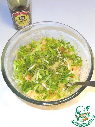 Зелень, 20 г оливкового масла (остальные 20 г для жарки), соевый соус, мяту, базилик, посолите, поперчите и перемешайте.