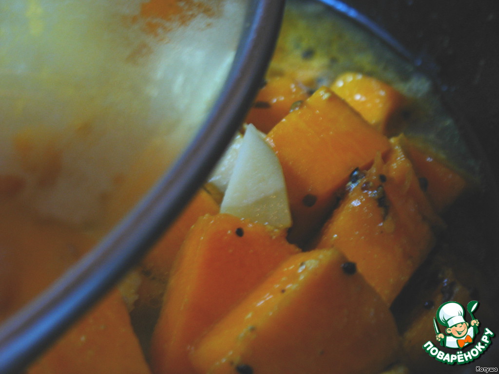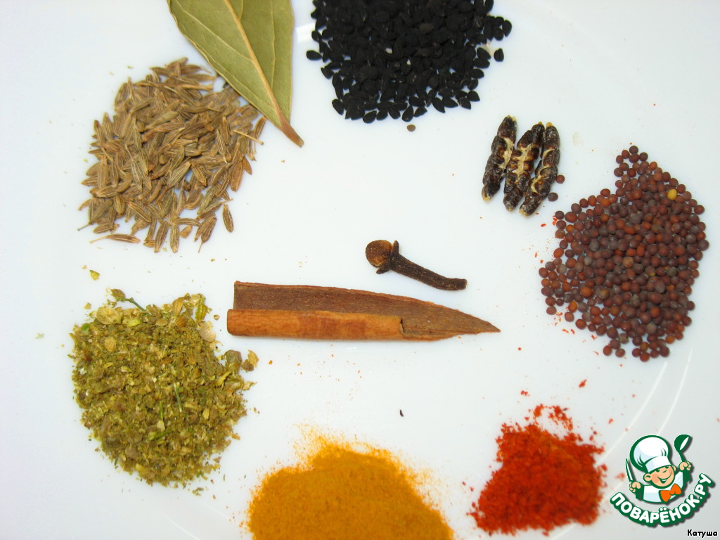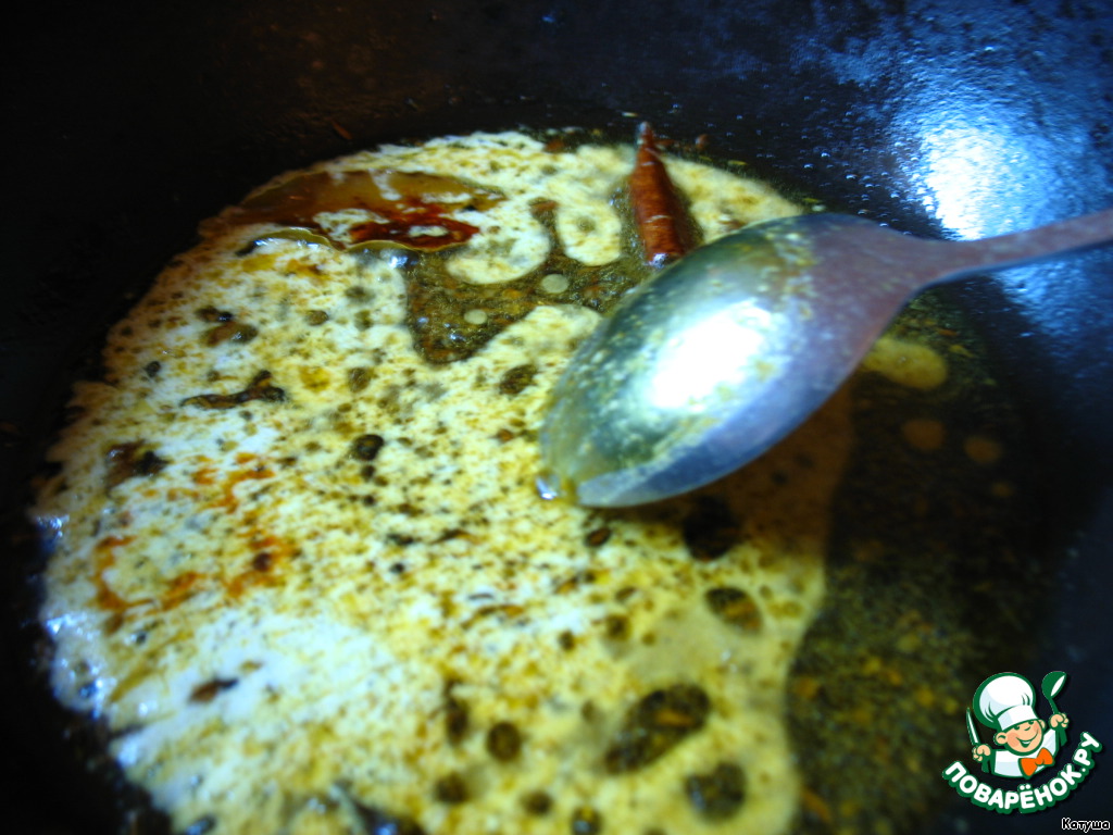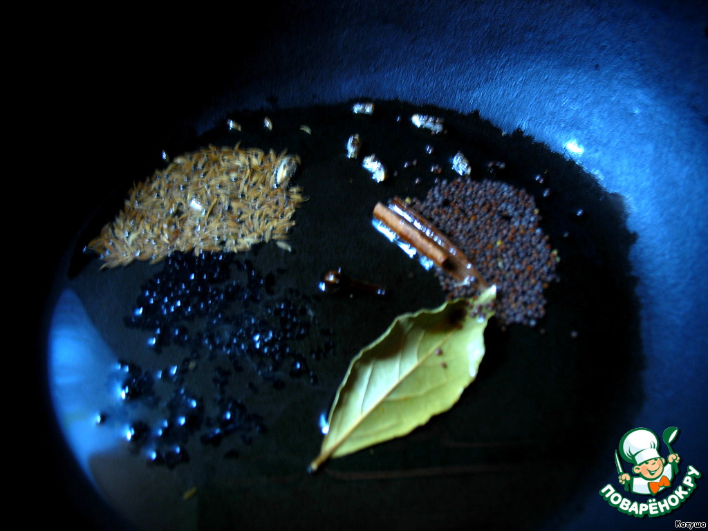 В 2 ст.ложках ги или другого масла обжарить немолотые специи до потрескивания горчицы.