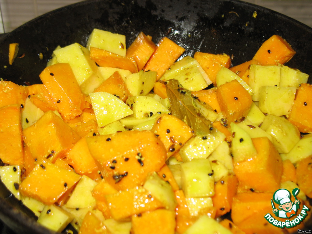 | Есть люди, которые не любят тыкву, есть, кто не любит картошку, а есть, кто не понимает специи. А тыква и картофель в стиле "марвари" помогает полюбить и то, и другое, и третье, так как всe здесь подобрано очень гармонично, и готовое блюдо никого не оставляет равнодушным. Проверено не один раз на моих знакомых «не едоках». Каждый раз не перестаю удивляться, какое впечатление производит это индийское кушанье. В идеале готовится с чили, но так как это за обе щeки едят мои дети, включая годовалую малышку, от острого перца пришлось отказаться и заменить его паприкой. |