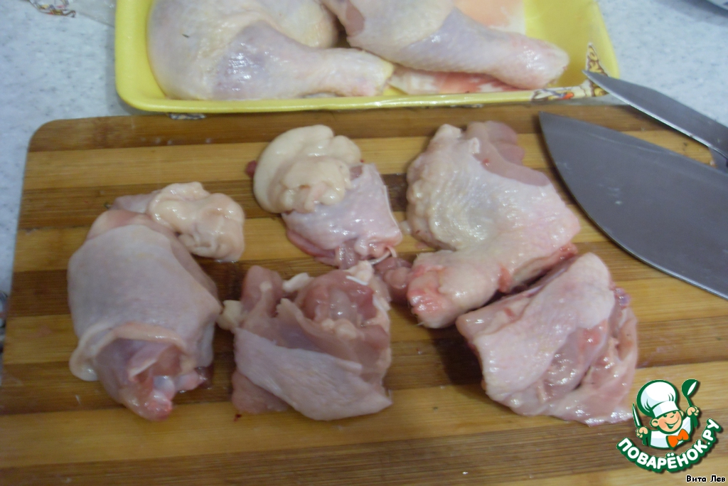 Куриное мясо (у меня была четверть курицы) режем на куски. Слегка обжариваем на сковороде.