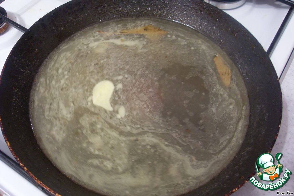 В сковороду, где обжаривалось мясо, наливаем 2стакана воды, 1 ст.л. масла, кидаем лаврушку, солим, перчим.