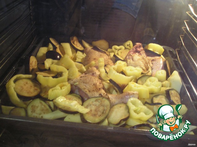 Температура - 200 градусов. Если есть - режим: гриль + конвекция. 35 минут. Через 20 минут мяско перевернуть, овощи поворочать.