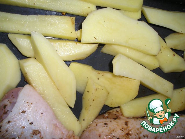 Всю красоту - на противень! По желанию, картошечку можно присолить и посыпать любимыми травками. Поливаем растительным маслом