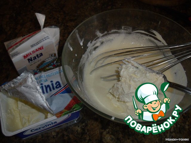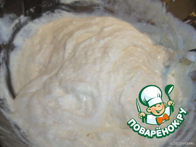 А теперь, хотите кушайте так, хотите добавим последний штрих. Я так кушать не хочу, мне новых ощущений подавай. Поэтому... пусть стынет наш пирог, а мы пока приготовим крем... Мягкий творог, остаток сливок и 3-4 ст. ложки сахара, как вам нравится послаще, нет? Делаем? Вооружаемся венчиком, который мы помыли пока пеклась основа.