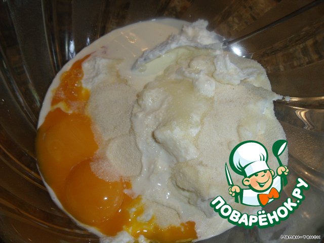 В творог добавьте сахар, ваниль, манную крупу, 3 ст. л. сливок (можно сметаны, можно растопить масло). Яйца: белки отделить от желтков. Желтки ввести в творожную массу, белки отправить в холодильник.