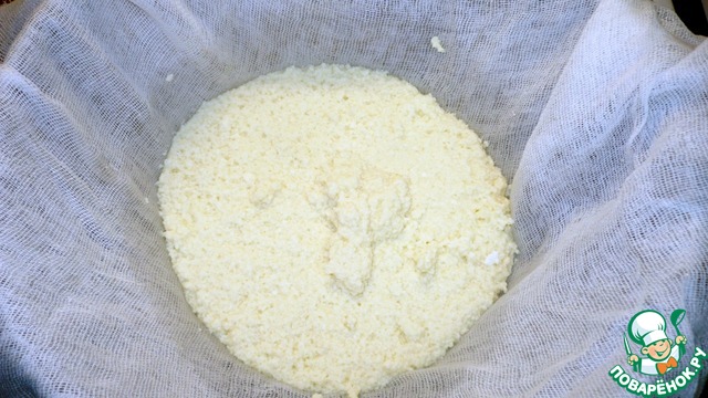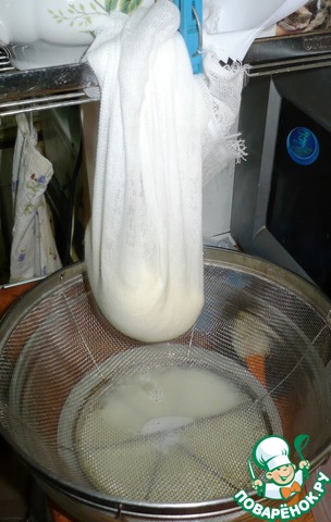 Ждем, когда стечет сыворотка. Я вот так подвешиваю для ускорения процесса.