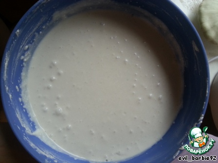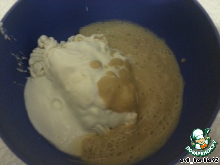 Должна получиться вот такая смесь, по консистенции напоминающая нежирную сметану. В эту смесь тонкой струйкой вливаем желатин, который нагрели, не доводя до кипения, до полного растворения крупинок. Вливаем желатин, постоянно помешивая нашу смесь. Еще раз перемешиваем все миксером. Взбивать не нужно.
