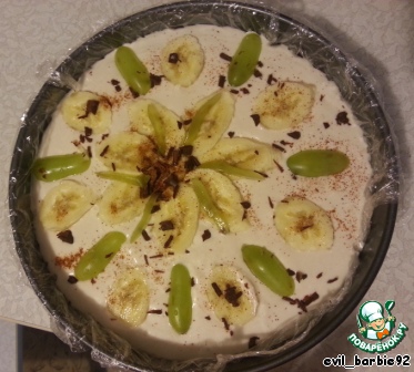 Выливаем полученную смесь на печенье. Поверх печенья можно уложить слой любых фруктов. Я обычно использую те же бананы. Иногда виноград. Верх чизкейка украшаю, как подскажет фантазия. В данном случае я украсила верх кусочками банана, виноградом, стружкой шоколада и корицей. Ставим в холодильник часа на 2-3, чтобы хорошо застыл.