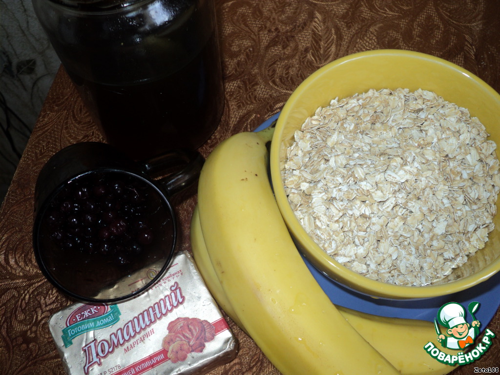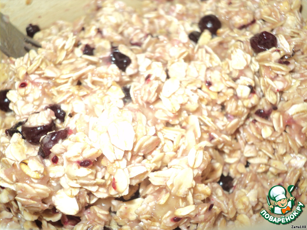 Объединить бананово-смородиновую ароматную массу с золотистой жидкостью (растопленный маргарин с медом), и геркулесовыми хлопьями, после чего тщательно перемешать.