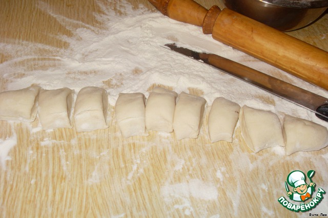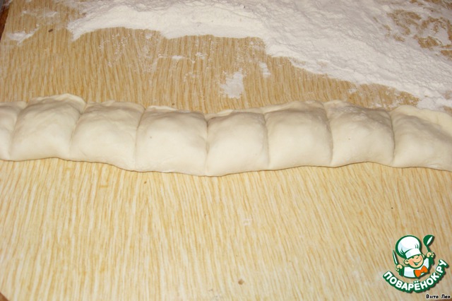 Достаем часть нашего теста, скатываем в колбаску и режем на кусочки. Раскатываем каждый кусочек, но не тонко, кладем начинку и защипываем края.