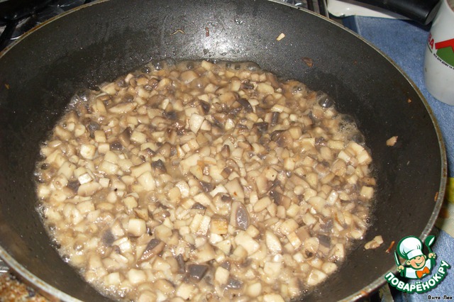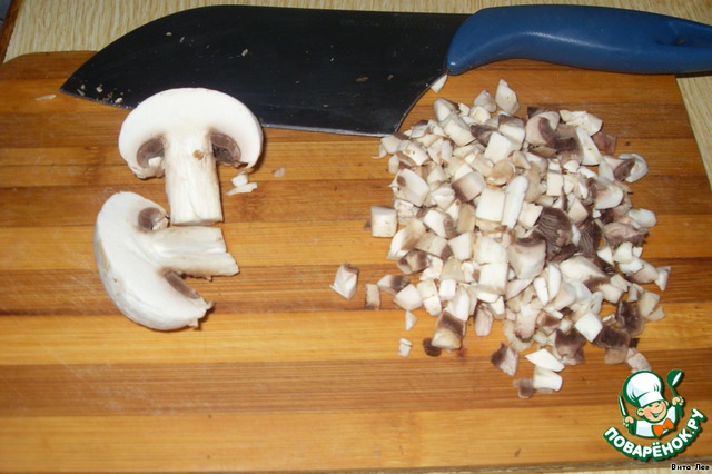 А пока займемся начинкой. Грибы моем, если нужно чистим и нарезаем мелко, но без фанатизма (учитывая, что они еще ужарятся).