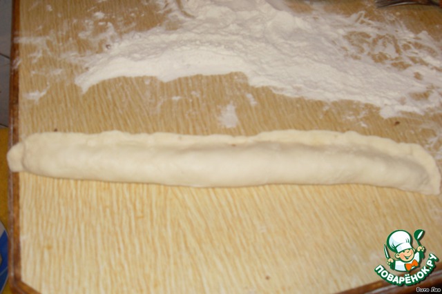 Я сделала из теста колбаску и раскатала ее поперек. Выложила вдоль начинку.