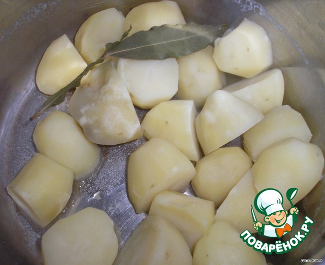 Из картофеля приготовить пюре. Посолить. Добавить обжаренный лук. Разделить пюре на 3 части.