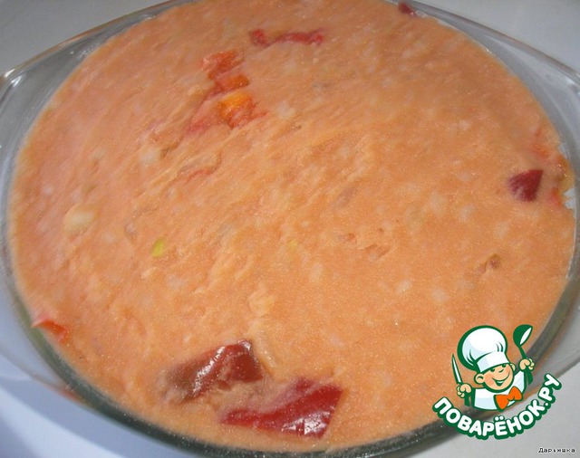 Красный цвет: в оставшуюся часть пюре добавляем томатную пасту и нарезанный соломкой болгарский перец. Перемешиваем.