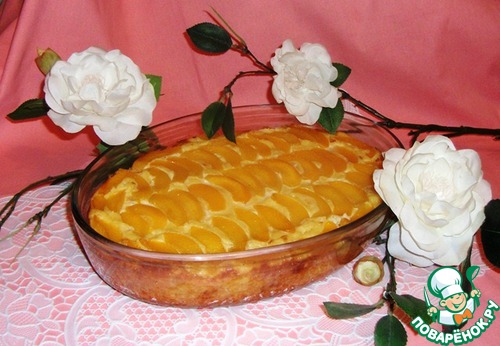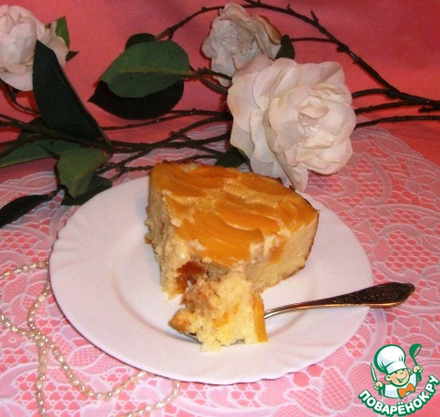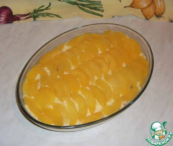 Сверху украшаем нарезанными консервированными персиками. Выпекаем в заранее разогретой духовке до 180 град. 40 мин.