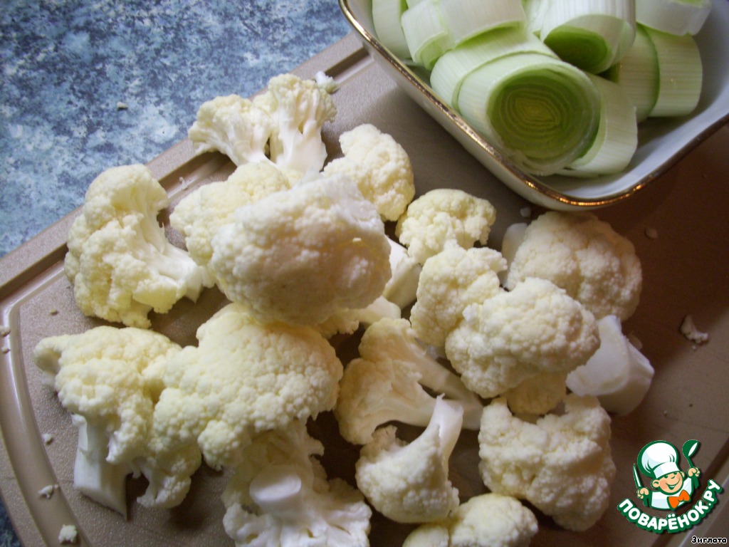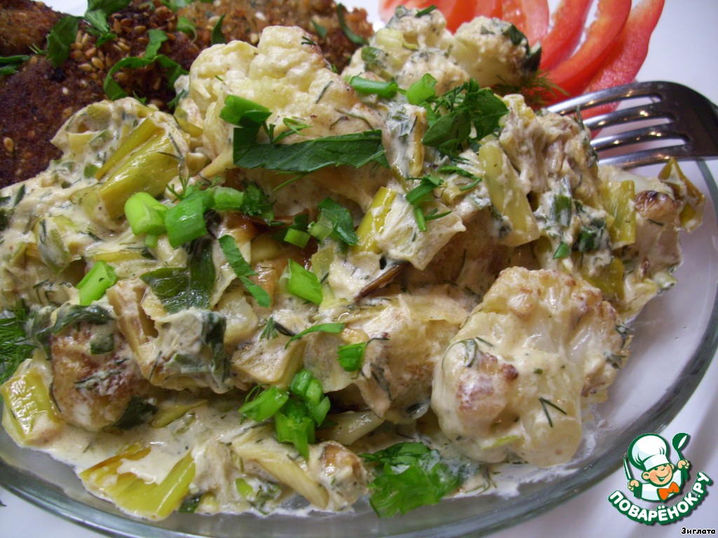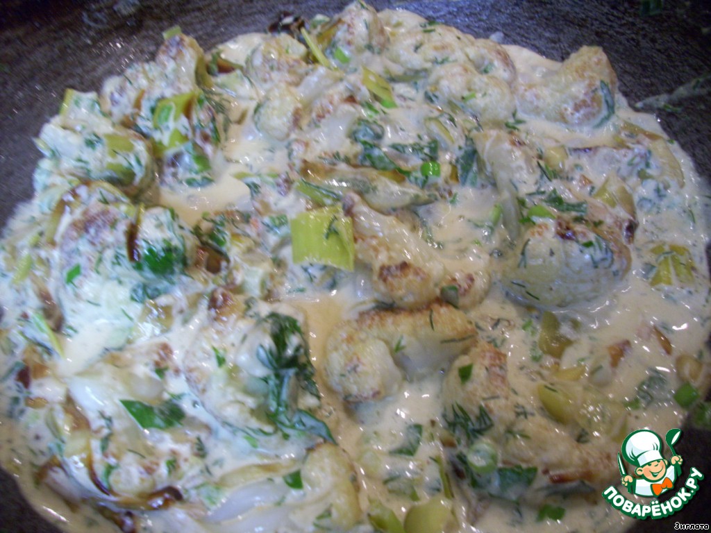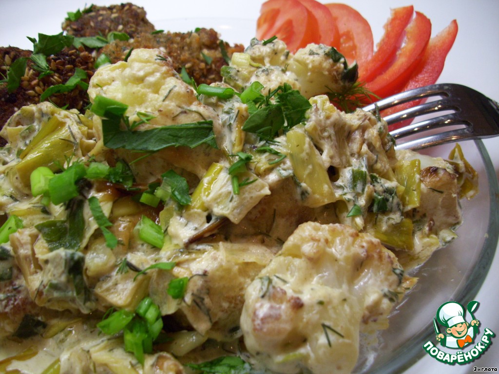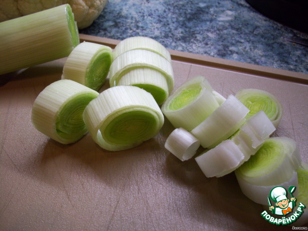 | Простой и быстрый гарнир к любому блюду!!! И в мыслях не было выкладывать его на сайт, пока не пролистала здесь все рецепты с луком-пореем. Их оказалось довольно много, но блюда, в которых этот ингредиент стоит в ряду основных, можно пересчитать по пальцам. И, на мой взгляд, совершенно незаслуженно. Итак: легкий, универсальный гарнир с луком-пореем и цветной капустой в сливочном соусе! Уверена – Вам понравится! |