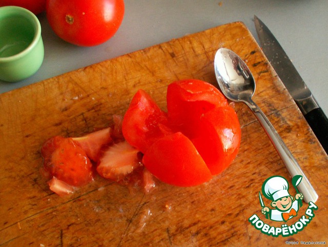 Помидор надрезаем крест-накрест не до конца, вынимаем мякоть