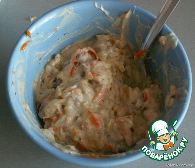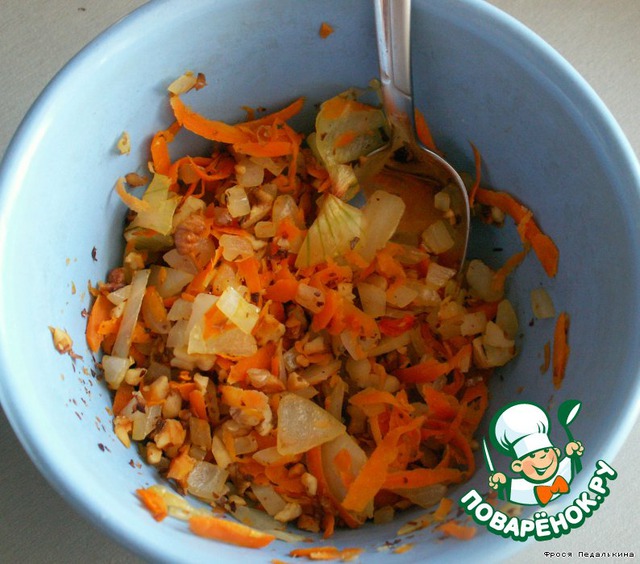 Смешиваем орехи, морковь и лук.