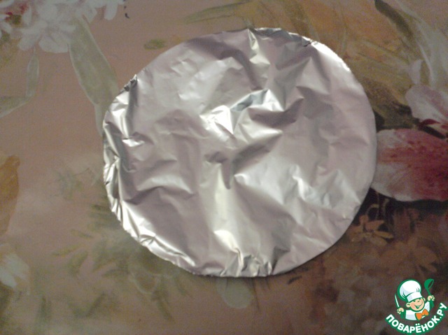 Фольгу сложите в несколько слоёв, в зависимости от количества наполненных стаканчиков, и вырежьте круг. Он должен быть больше чем верхнее отверстие ваших стаканчиков где-то на один сантиметр по всему кругу, или, говоря математическим языком: радиус круга из фольги должен быть примерно на один сантиметр больше радиуса верхнего отверстия стакана. Извините, что я так сложно выражаюсь :).