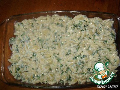 В соус добавить отваренные макароны и всю эту массу перемешать. Выложить в форму для запекания.