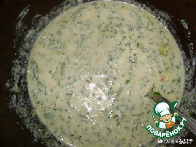 Приготовить соус: творог размять, добавить яйца, майонез, сметану, нарезанную зелень, измельченный чеснок и универсальную приправу. Все тщательно перемешать.