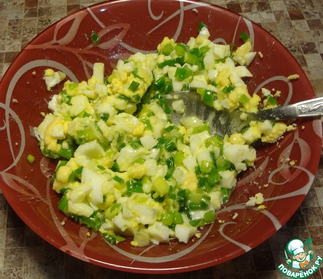 Отварила два яйца вкрутую, мелко порезалаи добавила в чашку к луку. посолила по вкусу и положила 1ст. л. расплавленного сливочного масла. но можно и без него))).