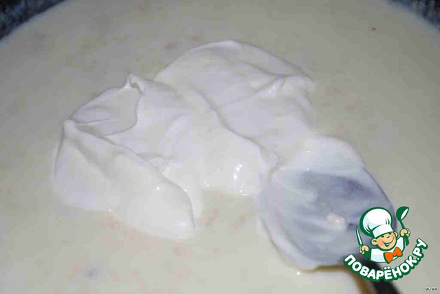 Медленно добавляем сливки.Постоянно помешиваем.Добавляем тертый на терке сырок.Размешиваем и добиваемся однородности.
