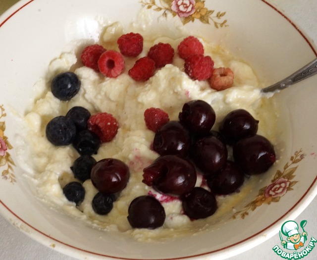 В творог добавить сахар, яйцо, перемешать как следует, добавить ягоды, перемешать аккуратно.