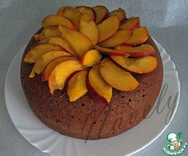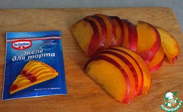 Для заливки я взяла нектарин, нарезала его ломтиками. Так же я использовала специальное желе для торта, приготовила его по инструкции на упаковке (добавила 2 ложки сахара и 200мл. воды, проварила 1 минуту)