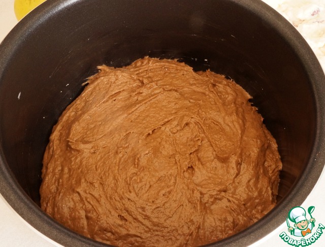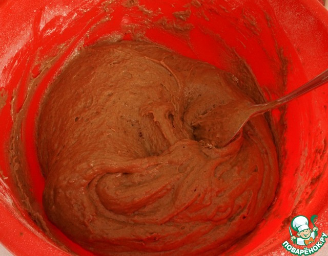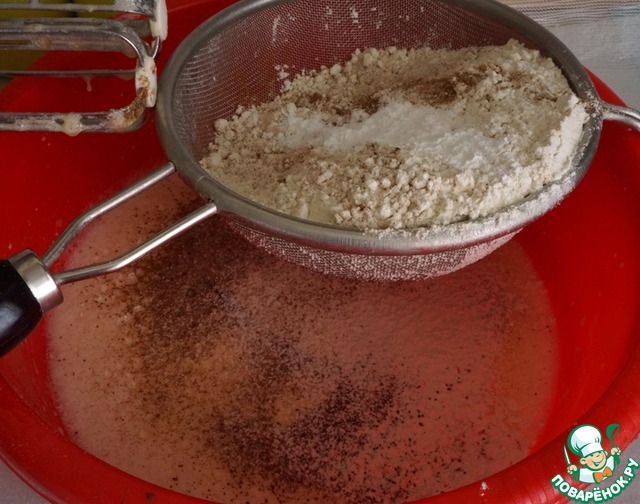 Просеять в тесто муку с кэробом (какао) и разрыхлителем.