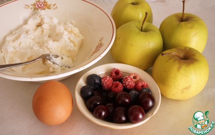 Это продукты для начинки. Яблоки помыть. Ягоды можно взять любые, у меня в данный момент вишня (косточки вынуть), голубика и замороженная малина.