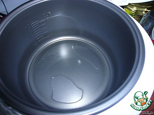 Мультиварку установить на программу "Выпечка" на 40 минут, на дно чаши налить подсолнечное масло и прогреть 3-5 минут (крышка закрыта).