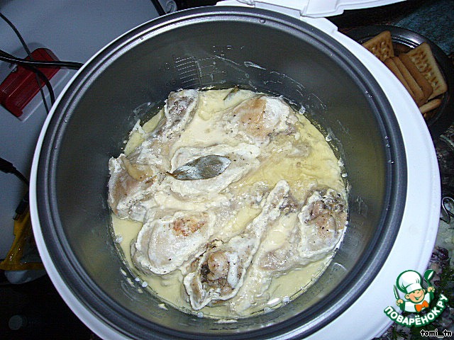 После окончания программы влить сметану, положить 2-3 лавровых листа, закрыть крышку и установить программу "Молочная каша" и пусть готовится до сигнала окончания.