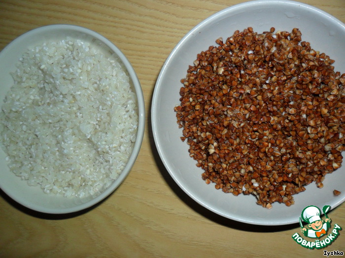 Берем в равных количествах рис и гречку, хорошо промываем.