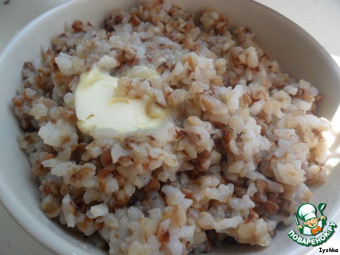 Смешиваем рис и гречку, добавляем сливочное масло и хорошо перемешиваем.