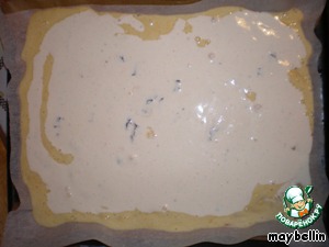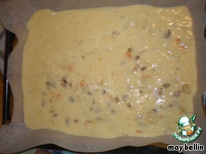 Прогреть духовку. Противень застелить пергаментом, смазанным растительным маслом. На него вылить тесто.